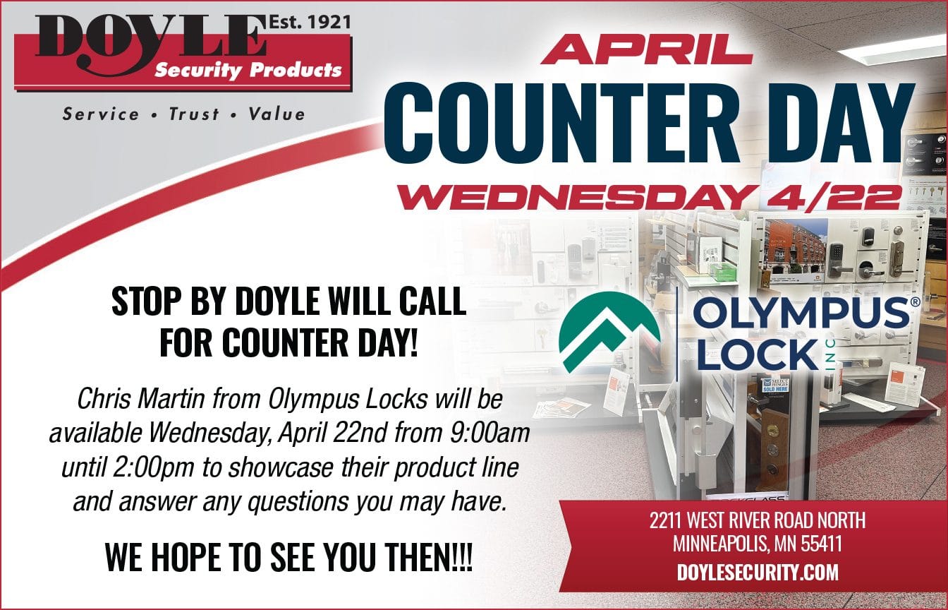 Our second April Counter Day will feature Olympus Lock. They will be here from 9am to 2pm to showcase their latest products and answer any questions you may have about their product lines. Stop by and say hello!
